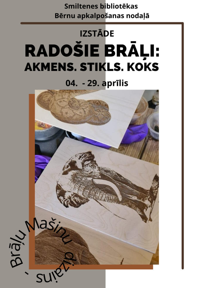 Smiltenes bibliotēkā, Bērnu apkalpošanas nodaļā (Sporta hallē) no 4. aprīļa līdz 29. aprīlim būs apskatāma radošo darbu izstāde “Radošie brāļi: Akmens. Stikls. Koks”.