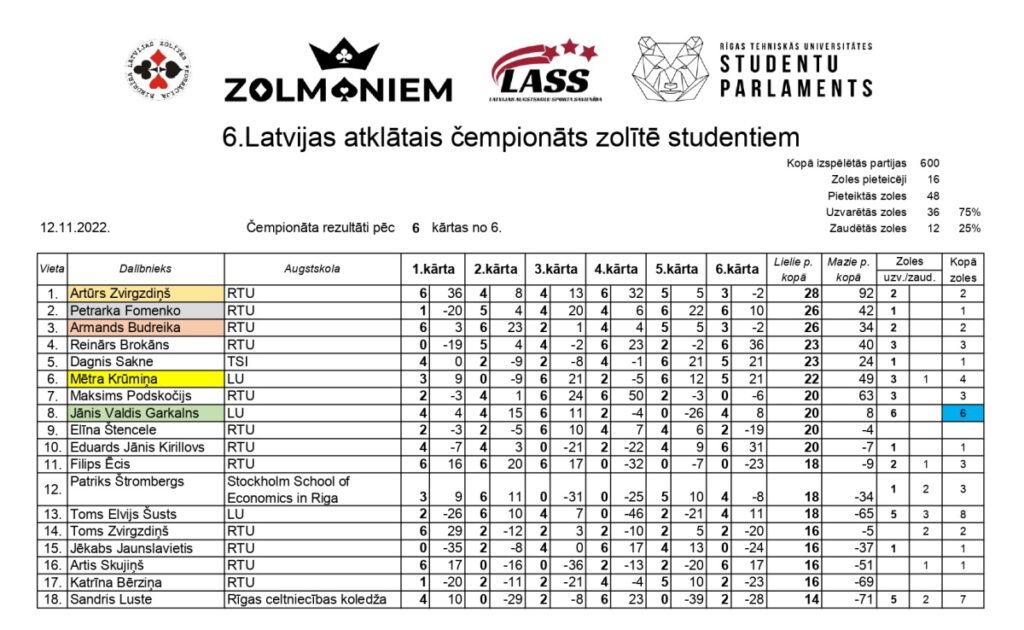 Pēc divu gadu pauzes 12.novembrī Rīgas Tehniskajā universitātē norisinājās sestais Latvijas atklātais čempionāts zolītē studentiem.