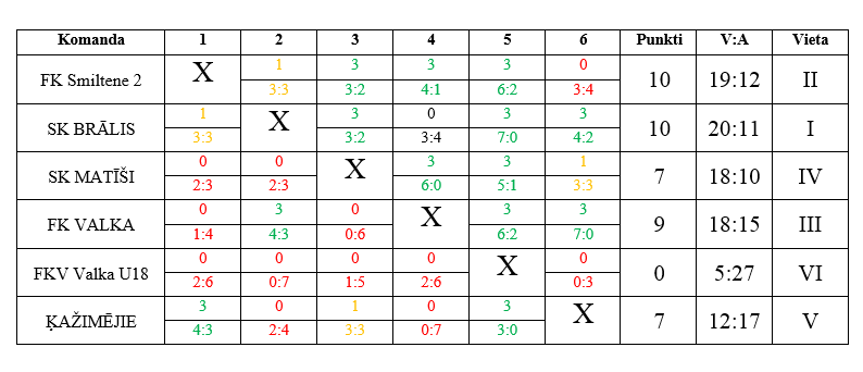 Otro vietu šoreiz ieņēma FK “Smiltene 2”, trešie FK “Valka”. Tabula gana trešajā posmā gana blīva, pirmo vietu no piektās šķir vien trīs punkti.