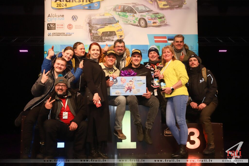 Apbalvošanas ceremonijā kopbildē ar rallija uzvarētājiem Emīlu Blūmu un Didzi Eglīti pievienojas viņu līdzjutēji un atbalstītāji, tostarp paši tuvākie ģimenes locekļi. FOTO: DACE JANOVA