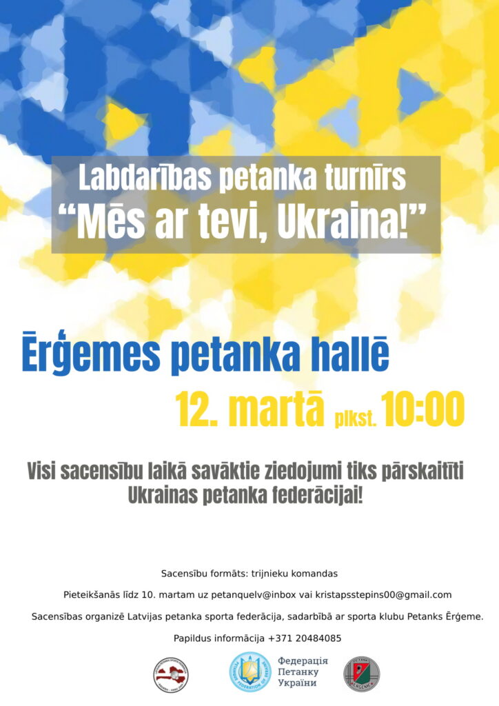 Latvijas petanka sporta federācija, sadarbībā ar sporta klubu “Petanks Ērģeme”, 12. martā plkst. 10:00 petanka sporta centrā Ērģemē organizē labdarības petanka turnīru “Mēs ar tevi, Ukraina!” Sacensību laikā tiks vākti ziedojumi, kas pēc tam tiks pārskaitīti Ukrainas petnaka federācijai.