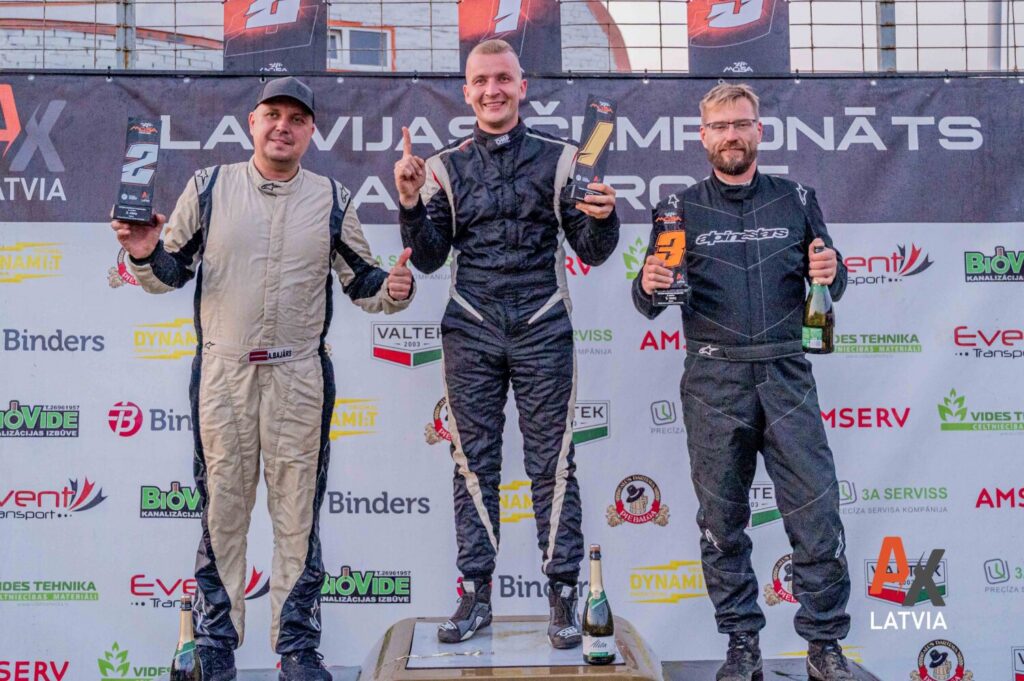 Uldis Megnis (vidū) uzvarēja arī Latvijas autokrosa čempionāta un kausa noslēdzošajā 6. posmā. 2. vietu šajā Bauskas posmā izcīnīja Aigars Bajārs (no kreisās), 3. vietu – Ints Jeršovs.