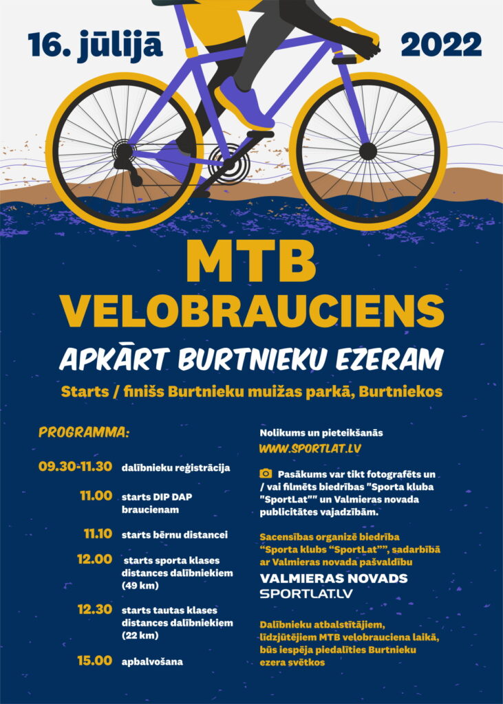 Pēc divu gadu pārtraukuma 16. jūlijā notiks MTB velobrauciena sacensības “Apkārt Burtnieku ezeram 2022” – ar jaunu starta/ finiša vietu Burtniekos, Burtnieku muižas parkā. Sacensības norisināsies jau 14. reizi. Pirmais velobrauciens tika aizvadīts 2007. gadā Vecates pagasta sporta laukumā, pulcējot 475 dalībniekus.