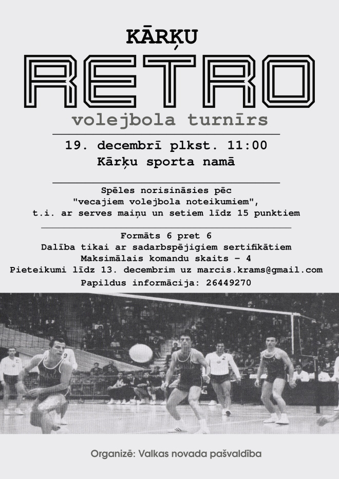 19. decembrī Kārķos norisināsies volejbola turnīrs “Kārķu Retro”, kuru pasākuma organizatori sacensības iecerējuši aizvadīt pēc “vecajiem noteikumiem”.