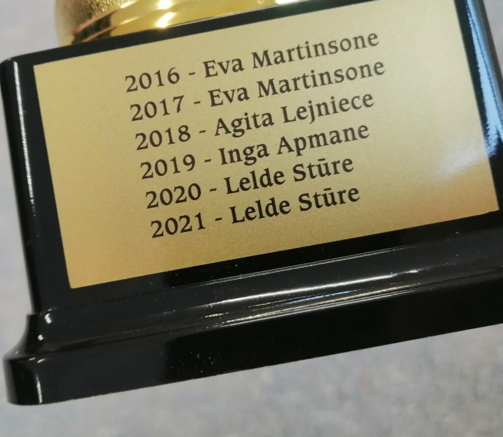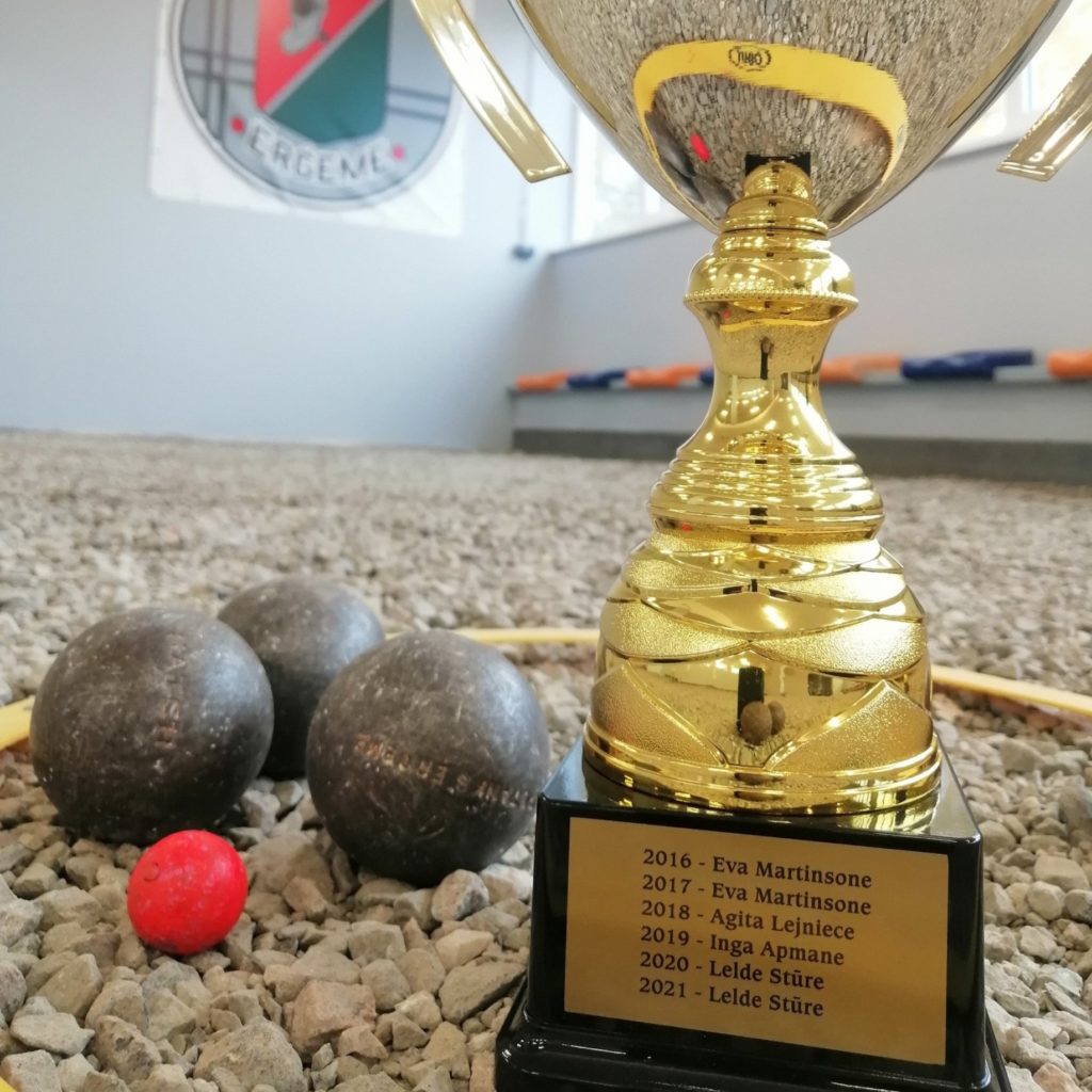 Sporta kluba “Petanks Ērģemes” spēlētājas Leldes Stūres vārds iegravēts uz ceļojošā Latvijas čempionu kausa.