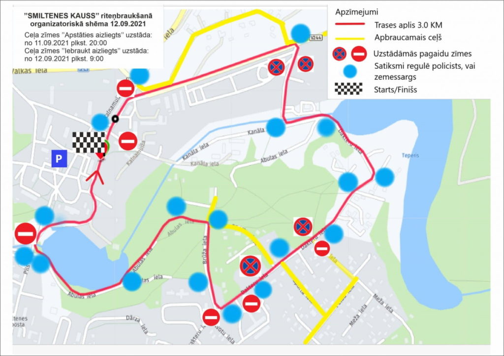 Norādītajā laikā transportlīdzekļu satiksme būs slēgta: Dakteru ielā – posmā no Tepera ezera līdz Brūža ielai,  Tāpat sacensību laikā SLĒGTI ielu pieslēgumi: