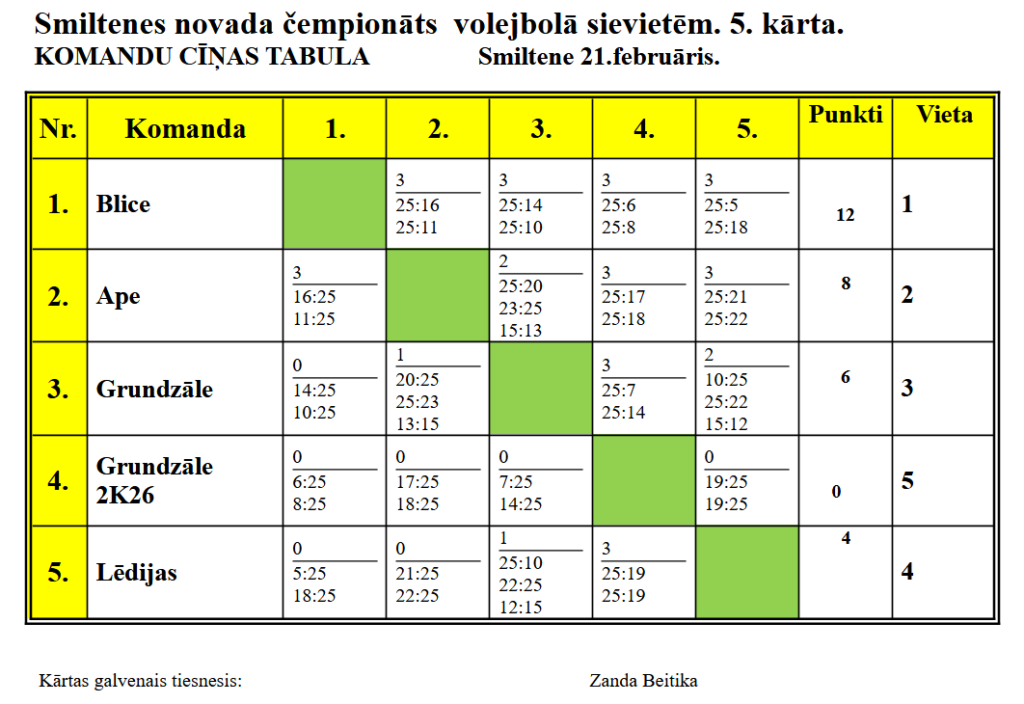 21. februārī Smiltenē notika Smiltenes novada sieviešu volejbola čempionāta 2026. gada 5. kārta. Par Smiltenes novada 2026. gada sieviešu volejbola čempionāta 6:6 piektās kārtas uzvarētājām pārliecinoši kļuva Blices volejbolistes.