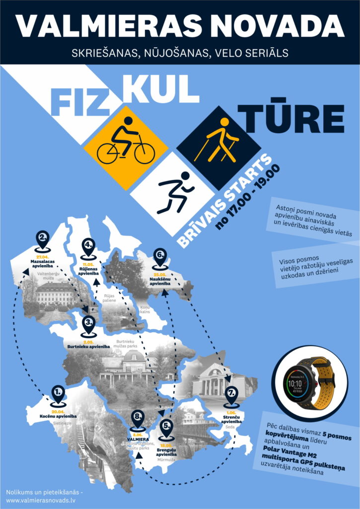 Pamodināt sevī sportisko garu, satikt aktīvus domubiedrus, iepazīt dabas vērtības, vēstures līkločus un atklāt daudz jaunā un nezināmā. To visu būs iespējams piedzīvot, piedaloties Valmieras novada “Fiz-Kul-Tūrē” – skriešanas, nūjošanas un velobraukšanas seriālā.