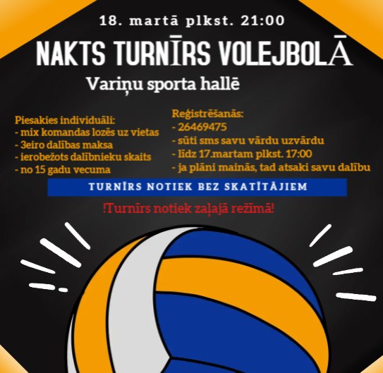 18.martā plkst.21.00,Smiltenes novada Variņu pagastā norisināsies nakts volejbola turnīrs.