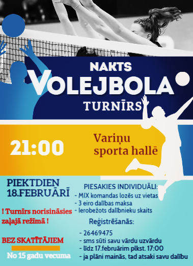 Piektdien, 18.februārī, pulksten 21 Variņu sporta hallē startēs volejbola nakts turnīrs.