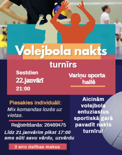 Volejbola entuziasti aicināti pieteikties dalībai turnīrā līdz 21. janvāra pulksten 17, uz tālruni 26469475 sūtot savu vārdu un uzvārdu. Mix komandas tiks lozētas uz vietas. Dalības maksa turnīrā – 3 eiro.