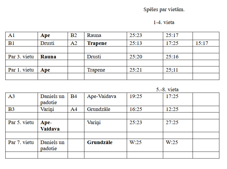 Komandas tika salozētas divās grupās pa četrām komandām katrā. Par grupu uzvarētājiem kļuva Apes un Drustu komandas. Tomēr tālākajās spēlēs Drustiem tik labi neveicās. Vispirms spēlējot ar A grupas otrās vietas ieguvēju Trapenes komandu pēc pārliecinošas uzvaras pirmajā setā 25:13 , tika piedzīvots zaudējums nākošajos divos setos 17:25 un 15:17. Arī spēlē par trešo vietu Drustiem neveiksme 20:25 un16:25 spēlē ar Raunu ko Drustiem izdevās pārspēt priekšsacīkstēs. Lielisku cīņas sparu rādīja Apes sporta skolotājas Aijas Latikas audzēkņi komanda Ape-Vaidava.