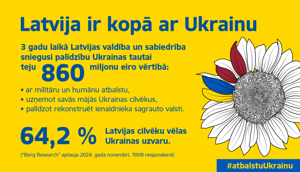 Latvija ir kopā ar Ukrainu. Mēs nepagursim, atbalstot ukraiņu cīņu par neatkarību un savu zemi. Latvijas sabiedrībā trīs gadu laikā joprojām ir liels atbalsts Ukrainai. 2024. gada nogalē veiktās aptaujas rezultāti rāda, ka 61,7% Latvijas iedzīvotāju atbalstīs Ukrainu līdz uzvarai. Tāpat 64,2% vēlas Ukrainas uzvaru karā, kā arī tikpat daudzi uzskata, ka, palīdzot Ukrainai, mēs sargājam Latviju no kara.
