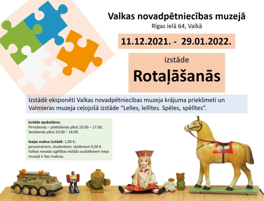 Valkas novadpētniecības muzejā no 2021.gada 11.decembra līdz 2022.gada 29.janvārim apskatāma izstāde “Rotaļāšanās”. Izstādē eksponēti Valkas novadpētniecības muzeja krājuma priekšmeti un Valmieras muzeja ceļojošā izstāde “Lelles, lellītes. Spēles, spēlītes”. Ceļojošajā izstādē atspoguļota galda spēļu, rotaļlietu, kino un teātra leļļu vēsture.