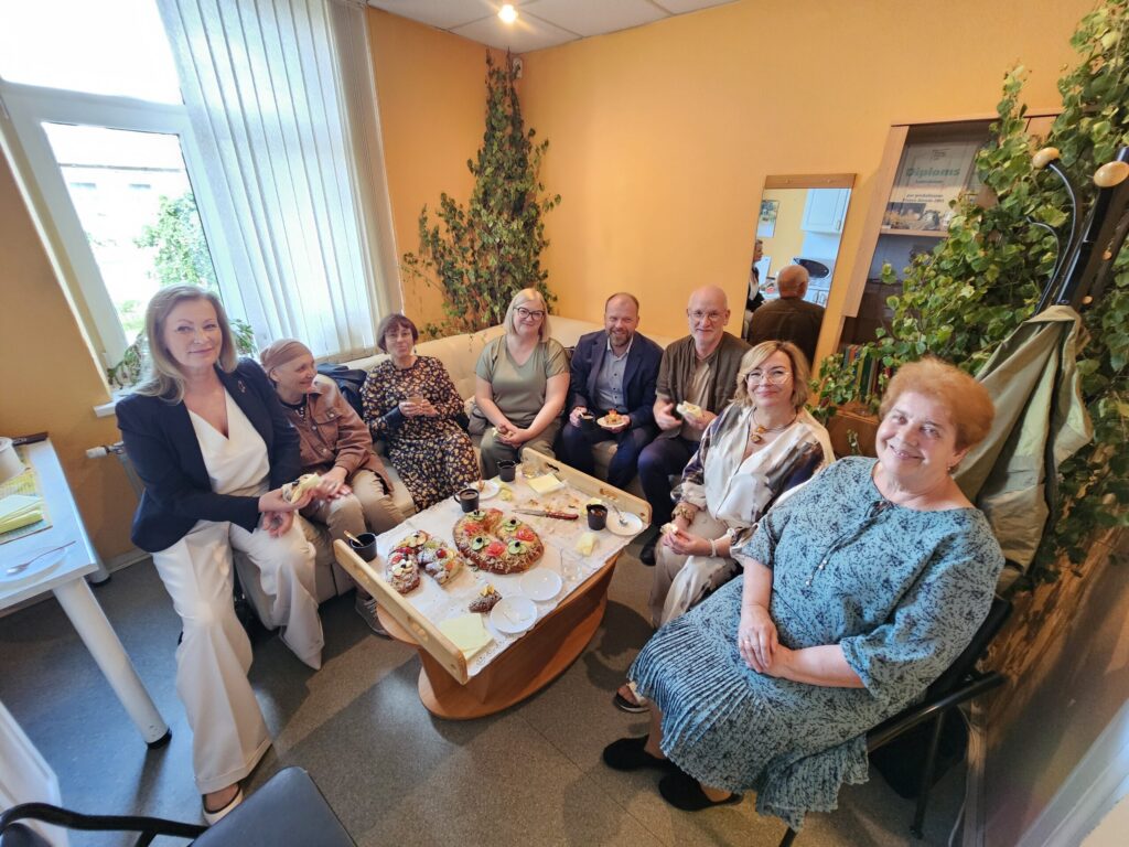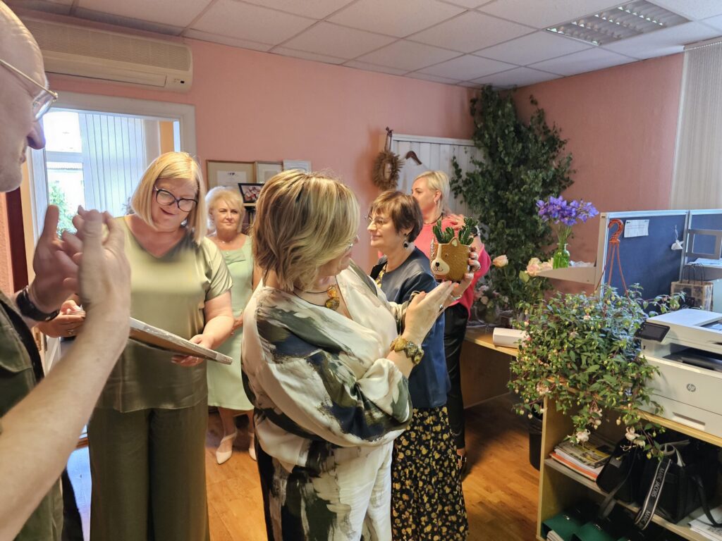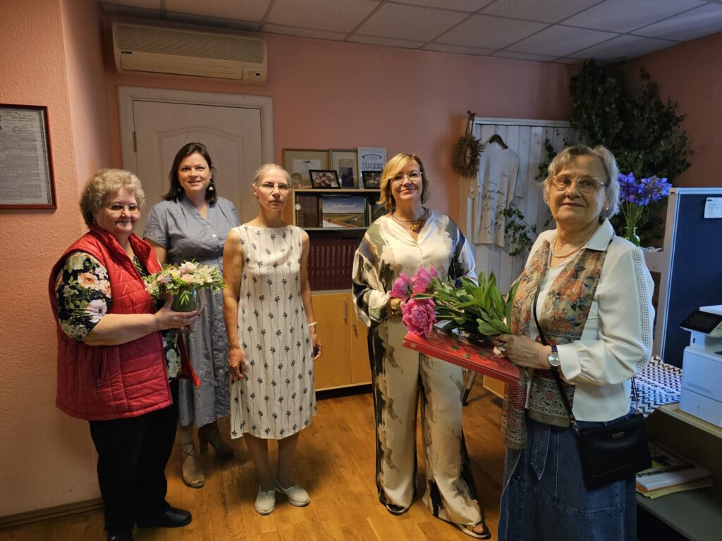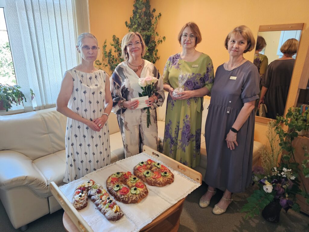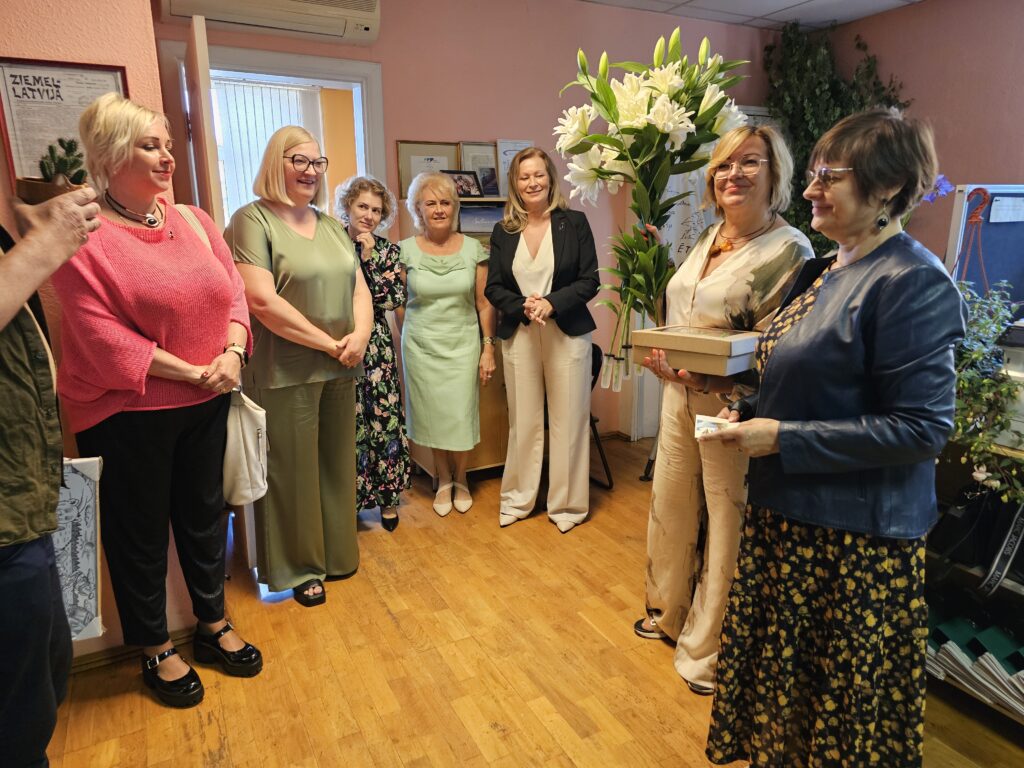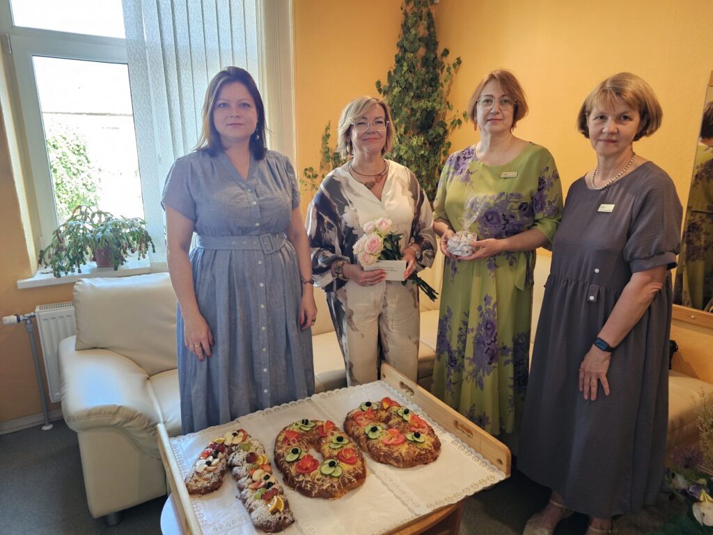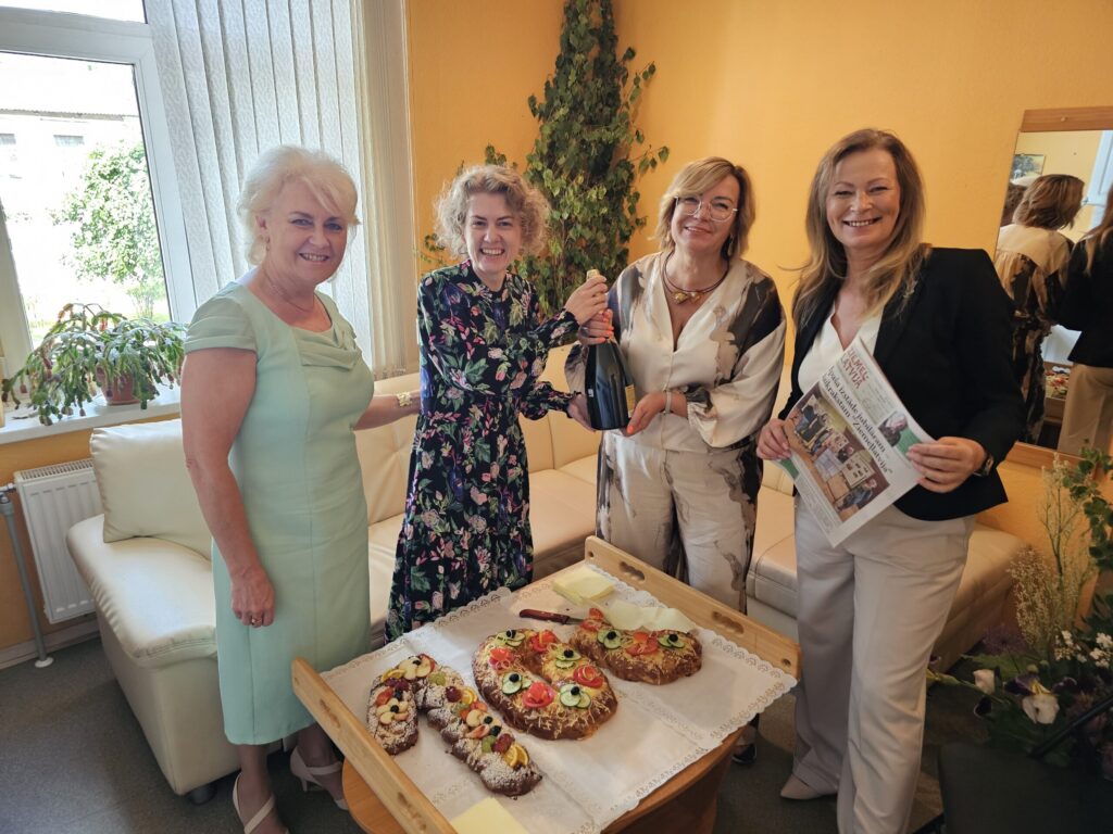 Pie simtgades kliņģera tika visi jubilāra sveicēji, kuri atnāca uz redakciju. Foto – viesi no Valkas novada Centrālās bibliotēkas Jana Čākure (no labās), Līga Rozīte un mājinieki – galvenā redaktore Ingūna Johansone un reklāmas projektu vadītāja, portāla ziemeļlatvija.lv redaktore Līga Orleana.