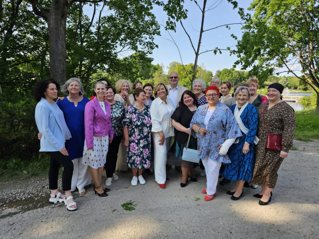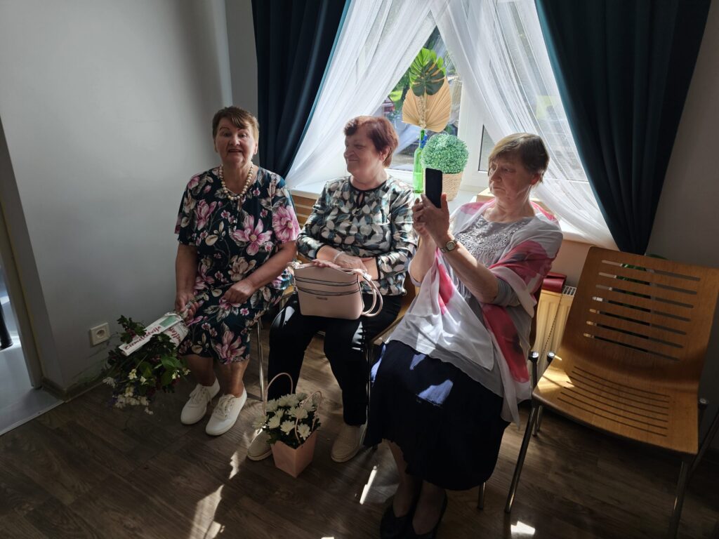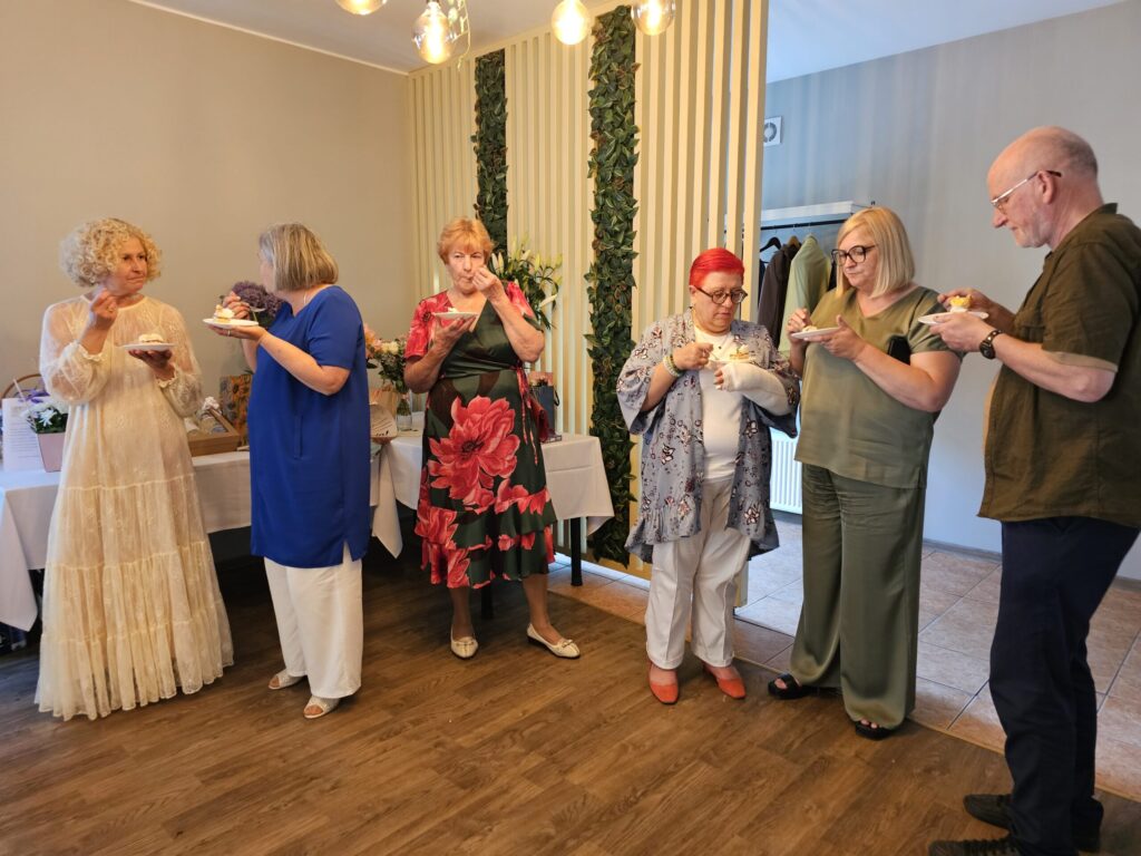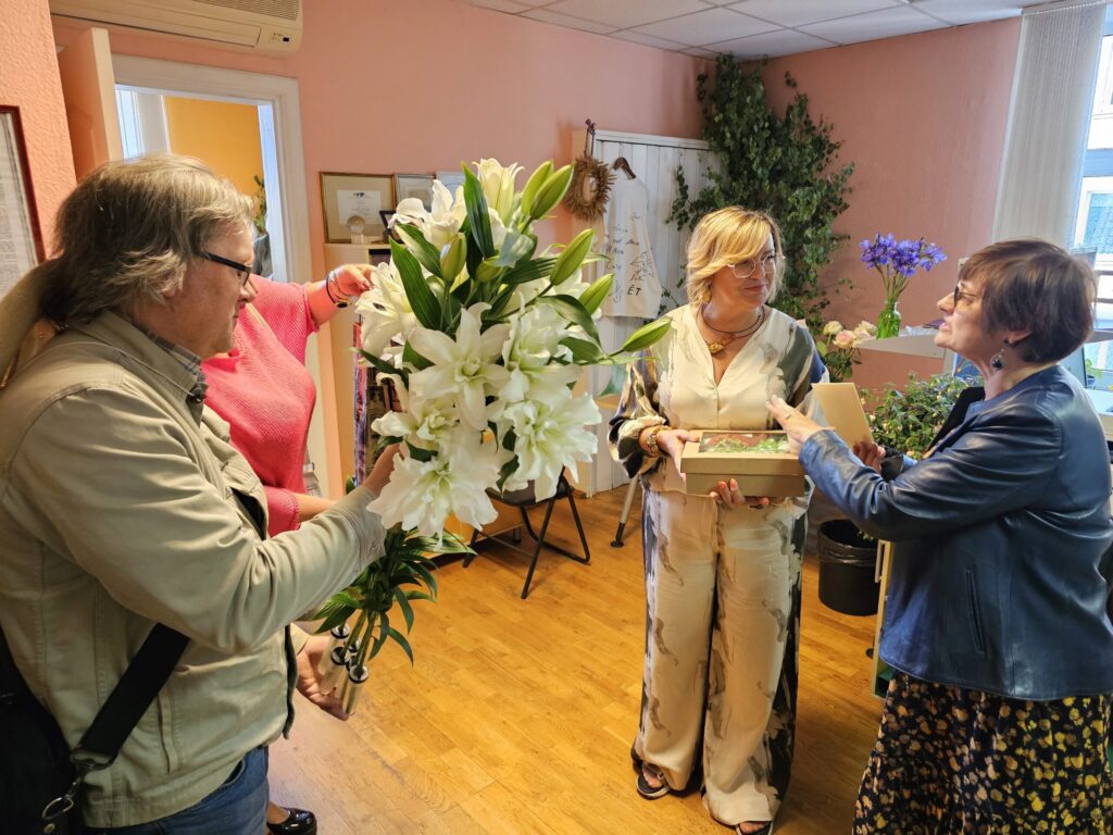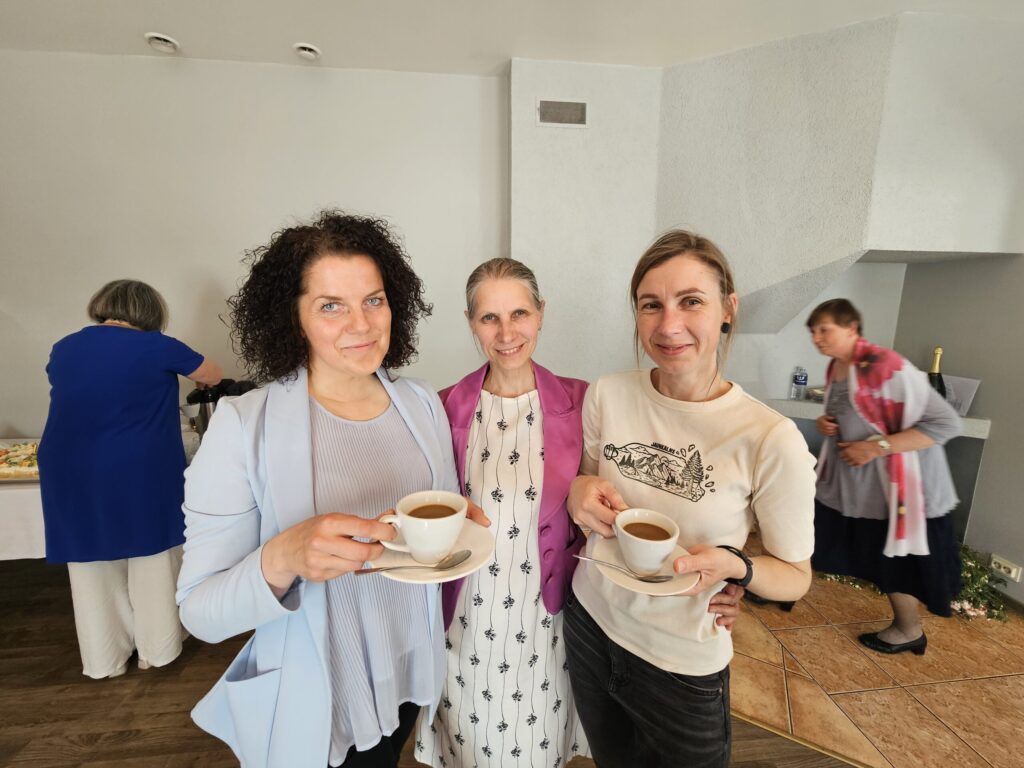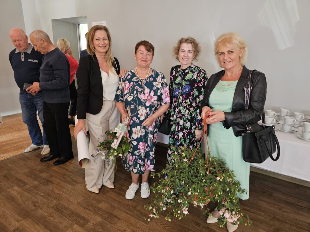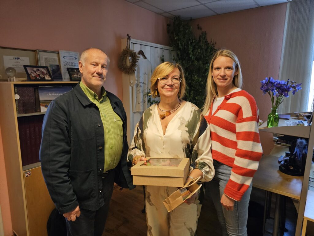 Pie simtgades kliņģera tika visi jubilāra sveicēji, kuri atnāca uz redakciju. Foto – viesi no Valkas novada Centrālās bibliotēkas Jana Čākure (no labās), Līga Rozīte un mājinieki – galvenā redaktore Ingūna Johansone un reklāmas projektu vadītāja, portāla ziemeļlatvija.lv redaktore Līga Orleana.