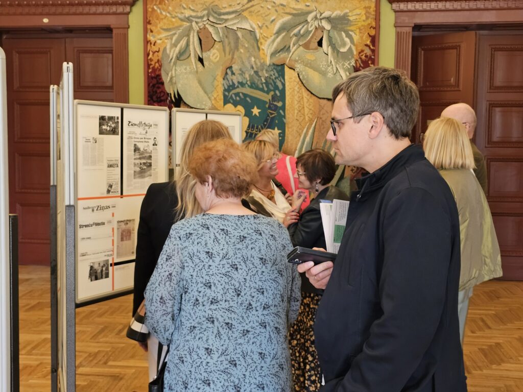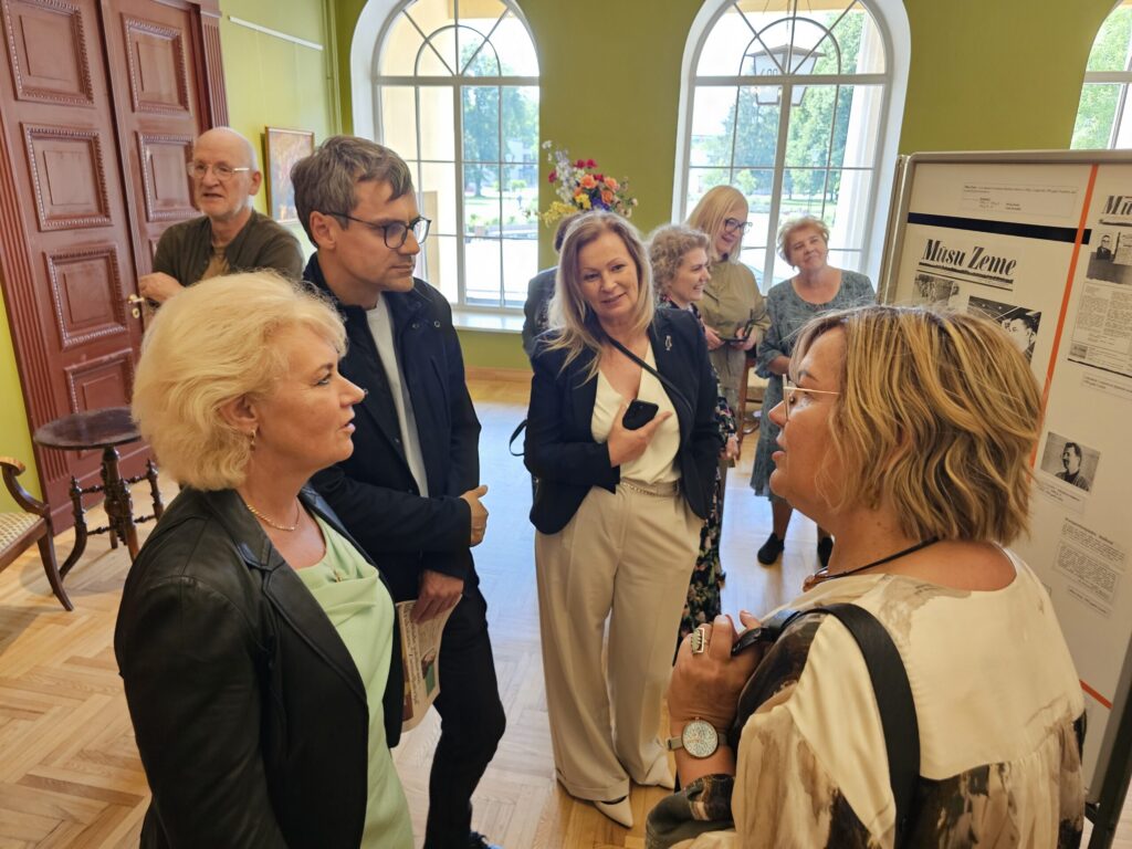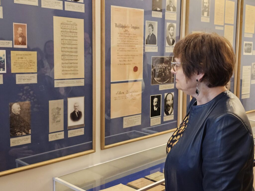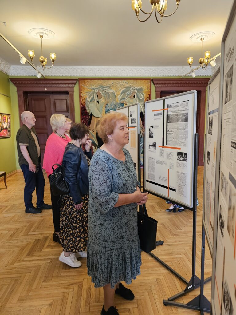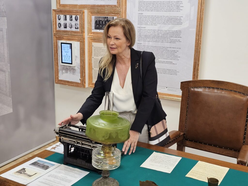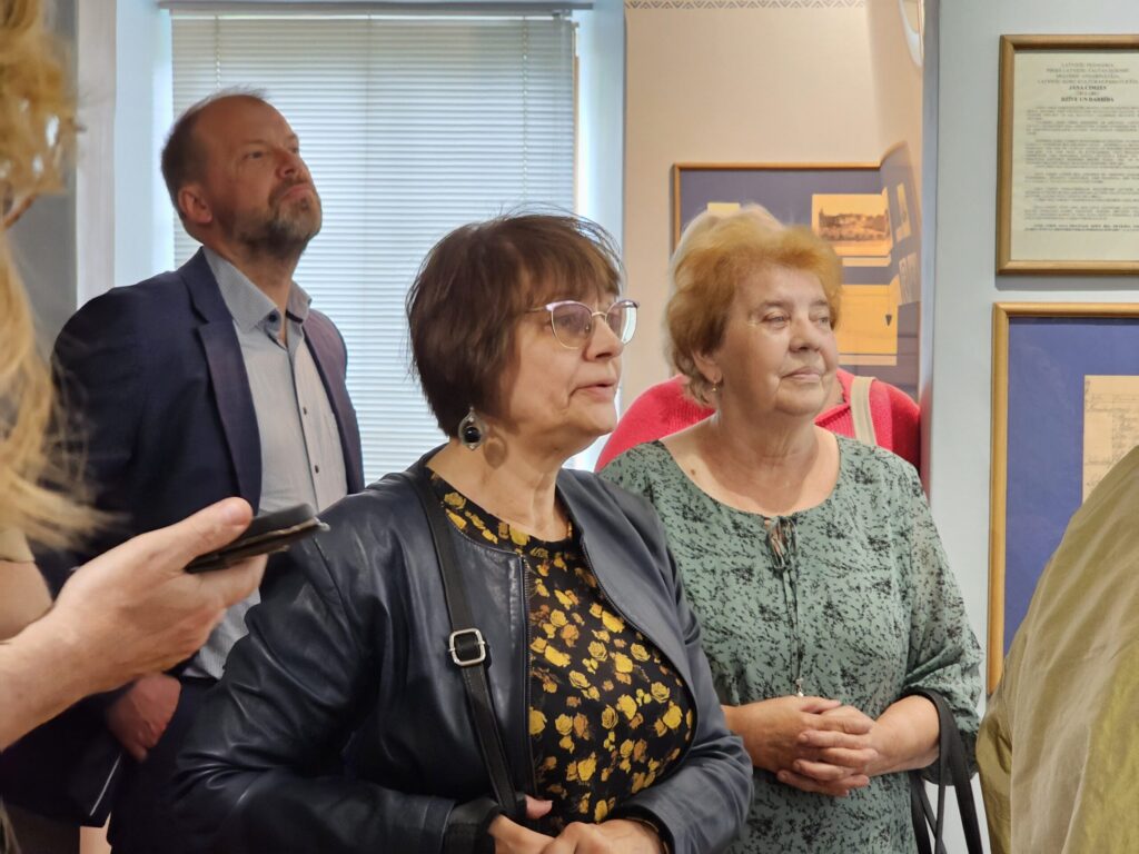 “Ziemeļlatvijas” bijusī žurnāliste Mārīte Dzene ar interesi aplūko izstādi “Ziemeļlatvijai – 100”.