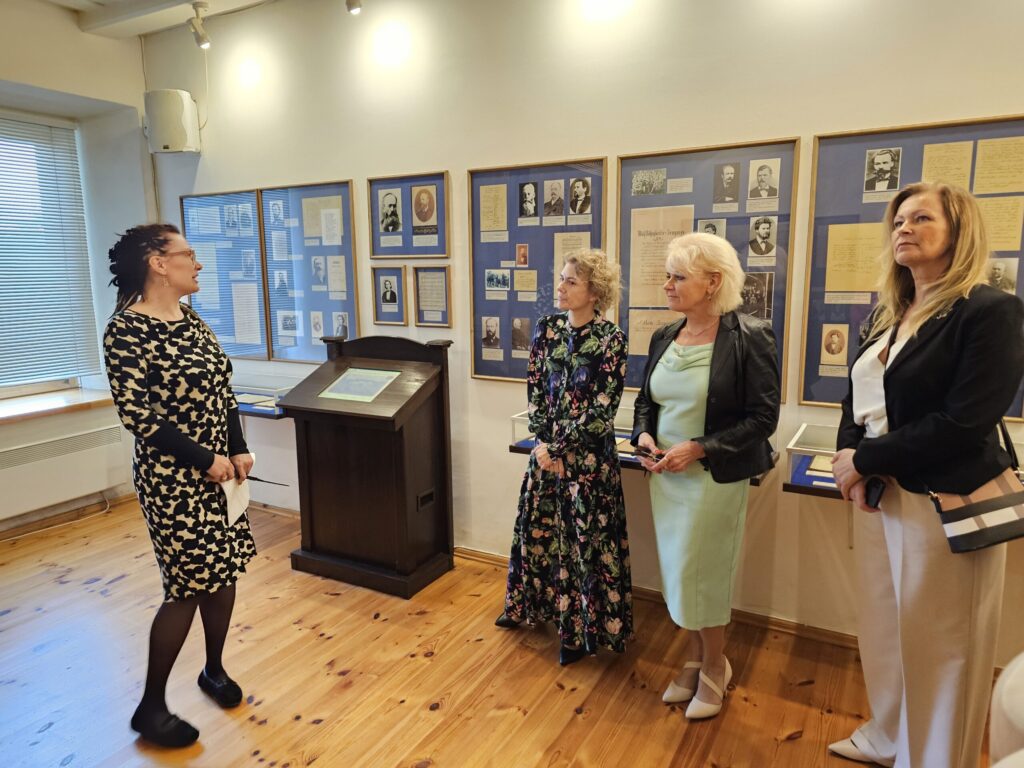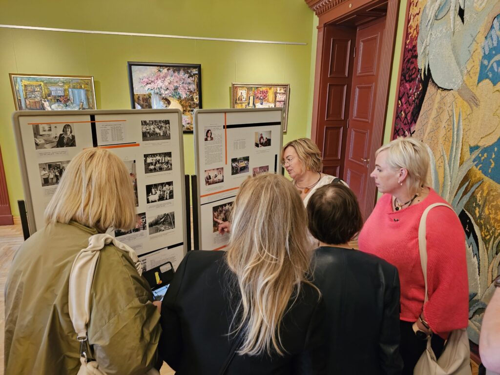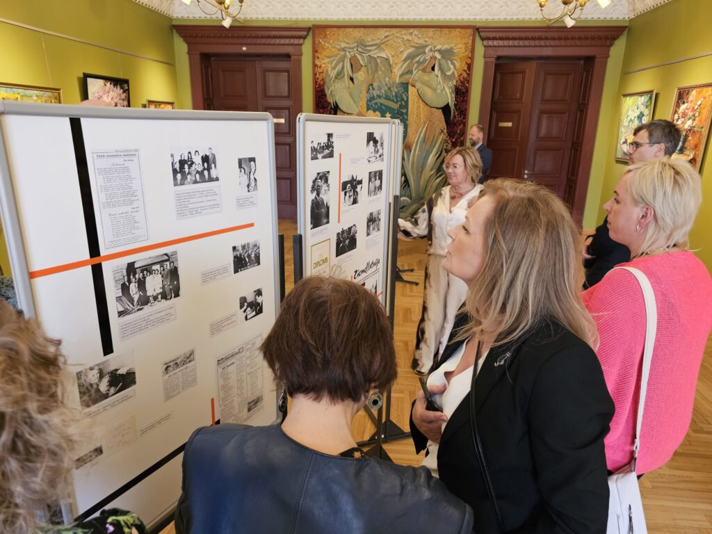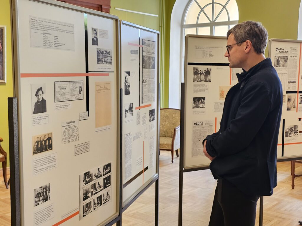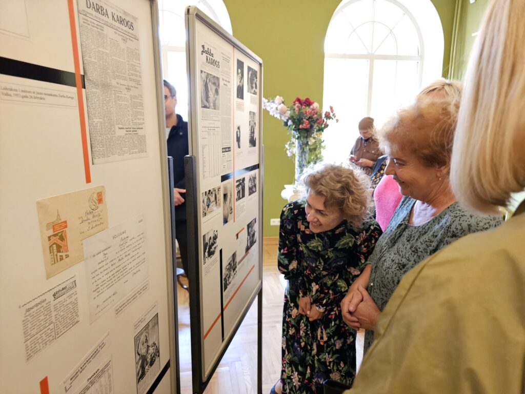 “Ziemeļlatvijas” bijusī žurnāliste Mārīte Dzene ar interesi aplūko izstādi “Ziemeļlatvijai – 100”.