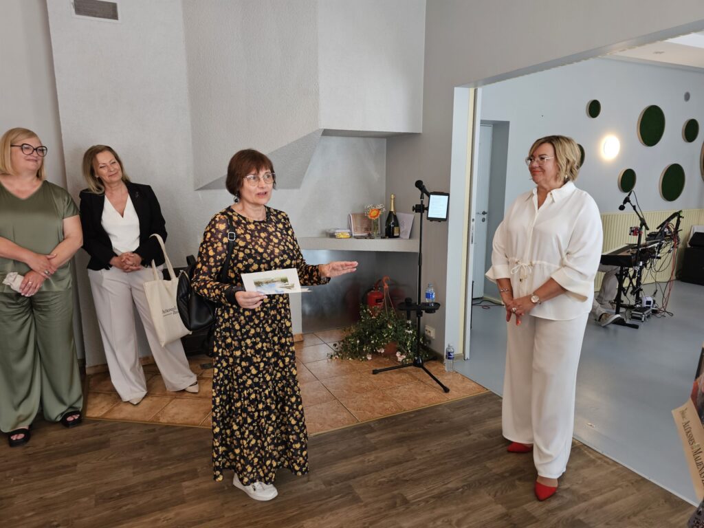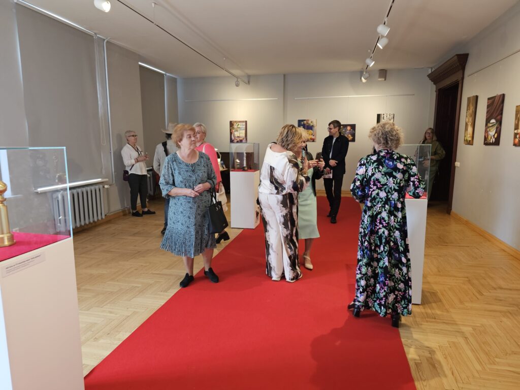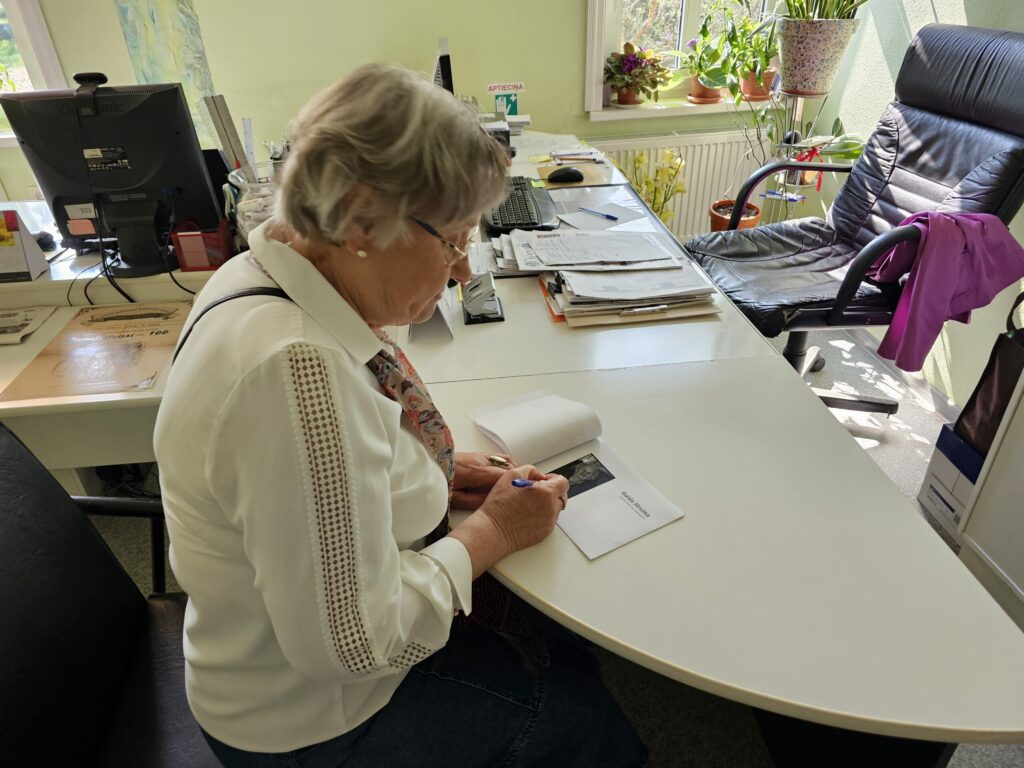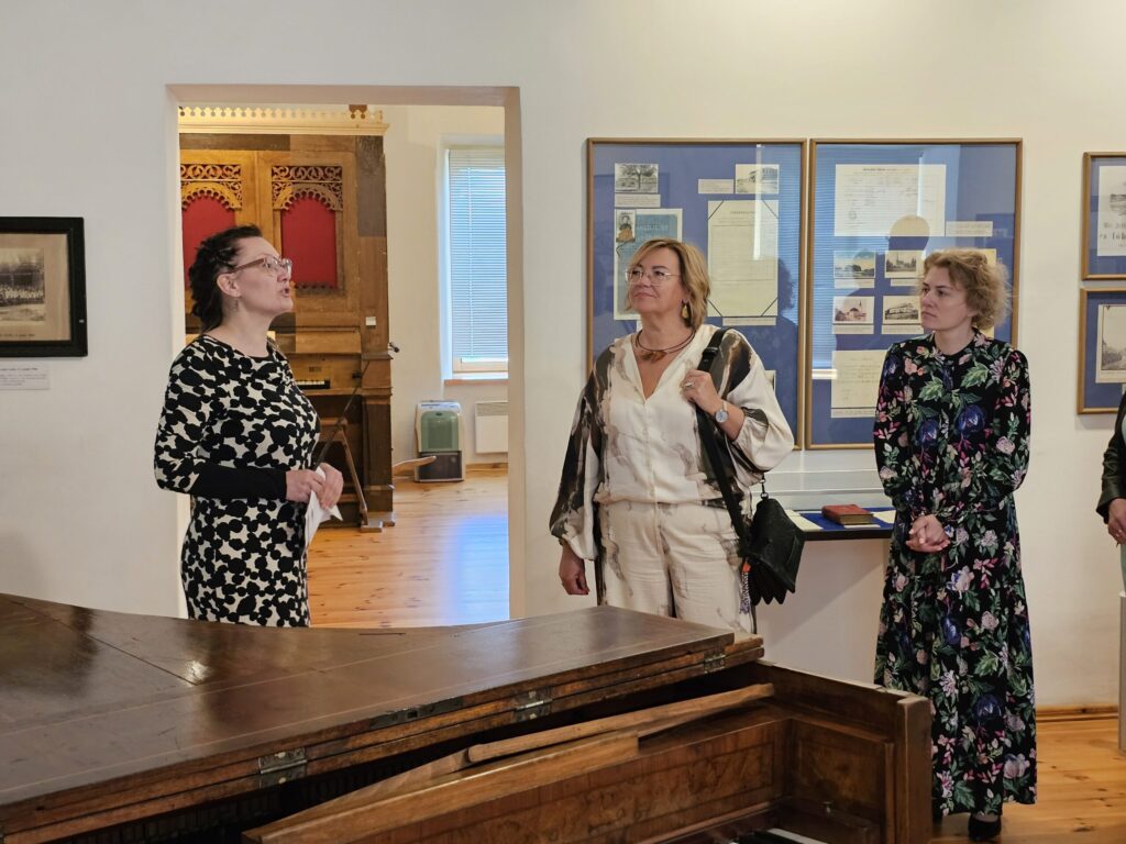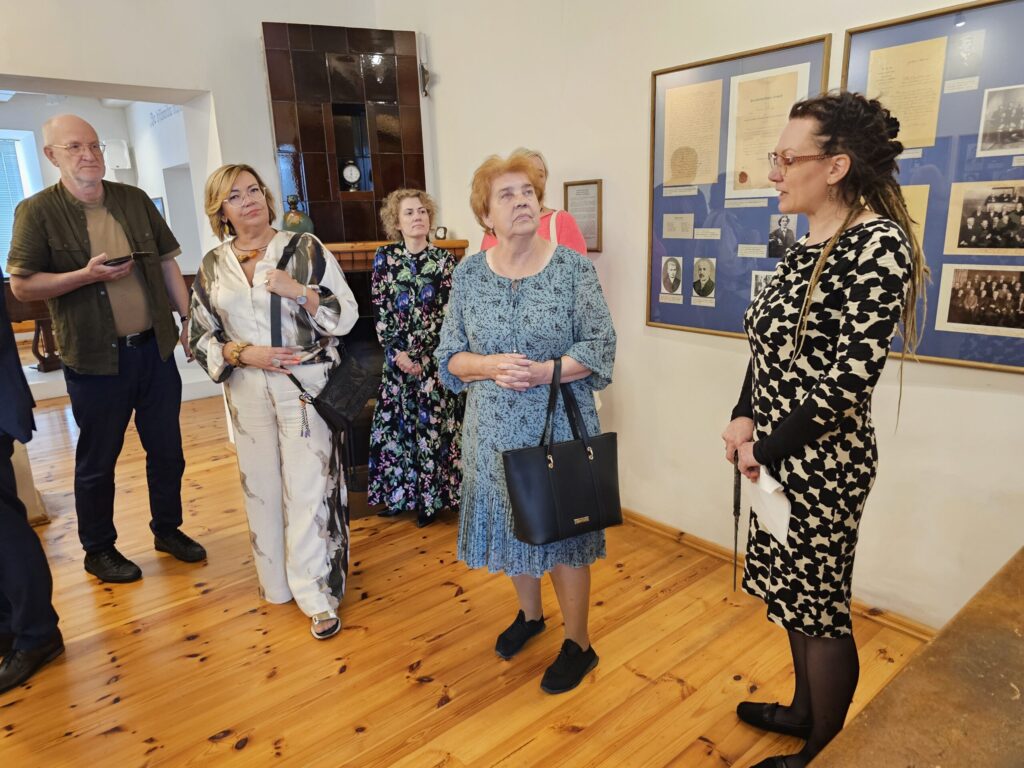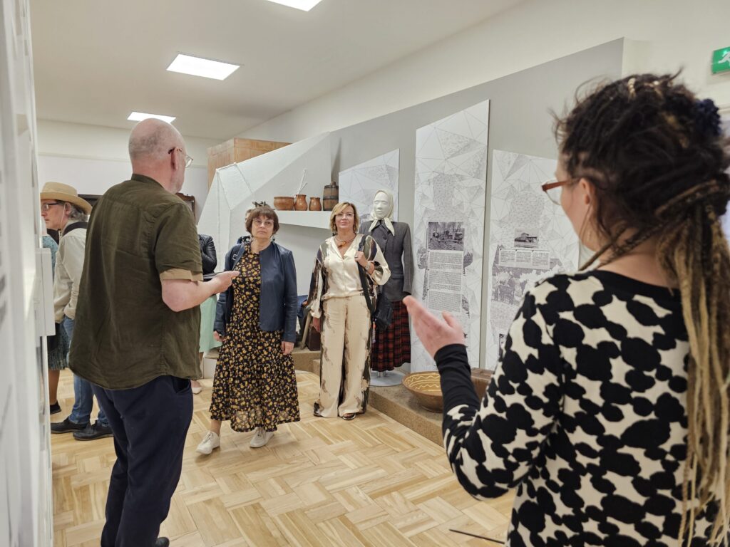 “Ziemeļlatvijas” bijusī žurnāliste Mārīte Dzene ar interesi aplūko izstādi “Ziemeļlatvijai – 100”.