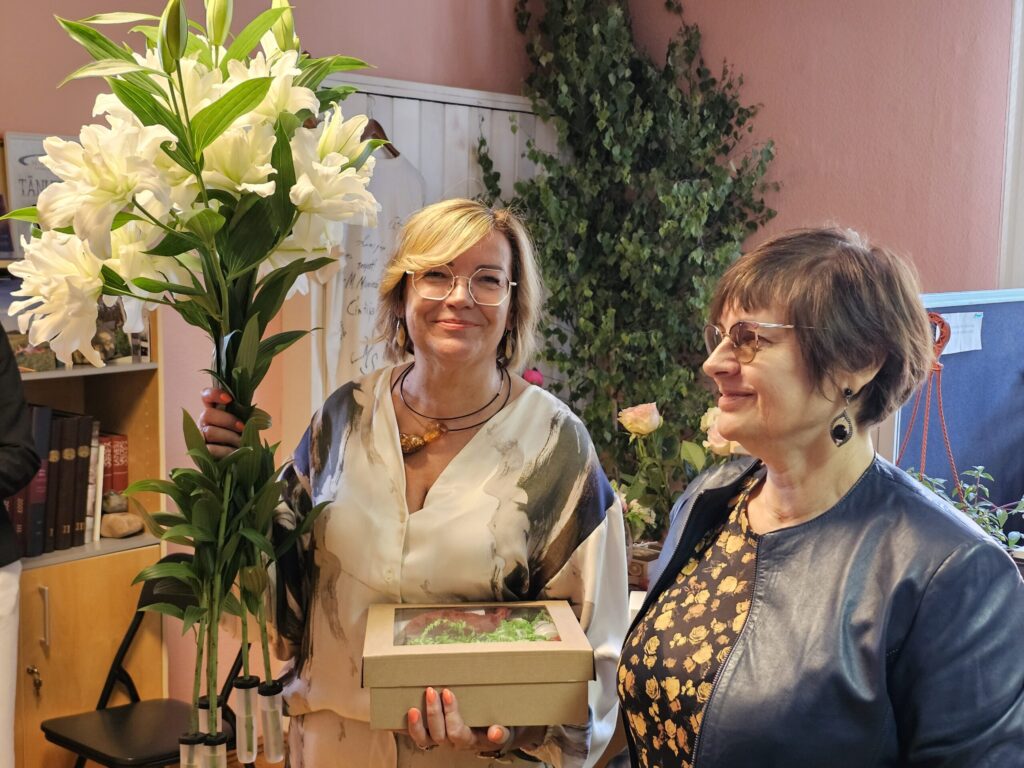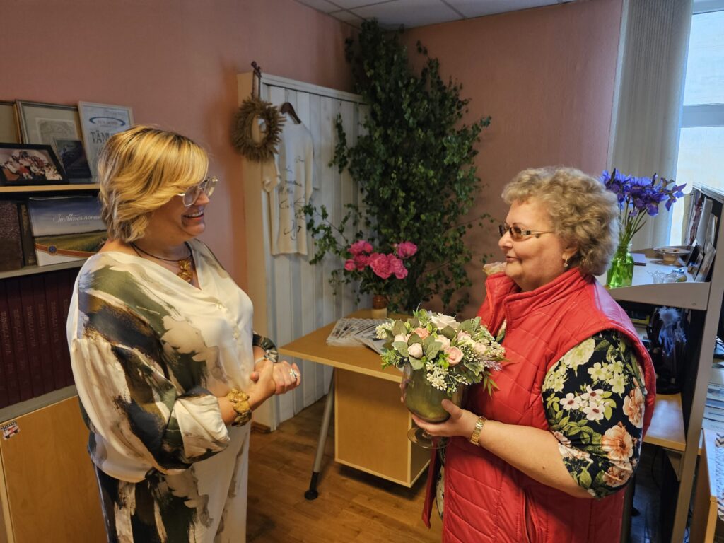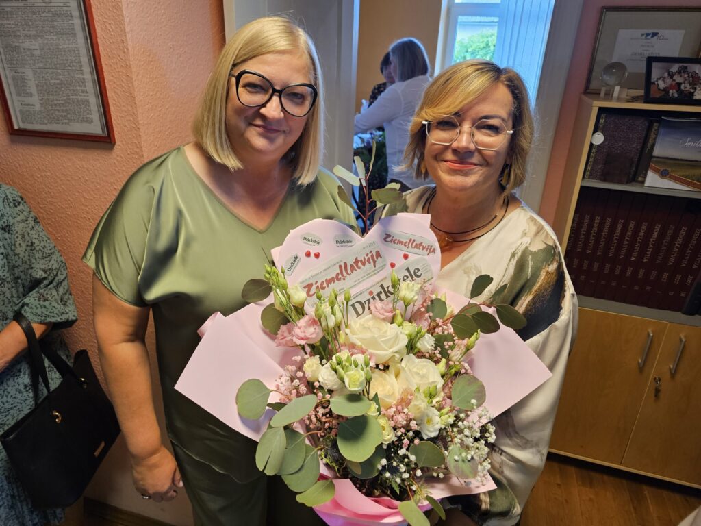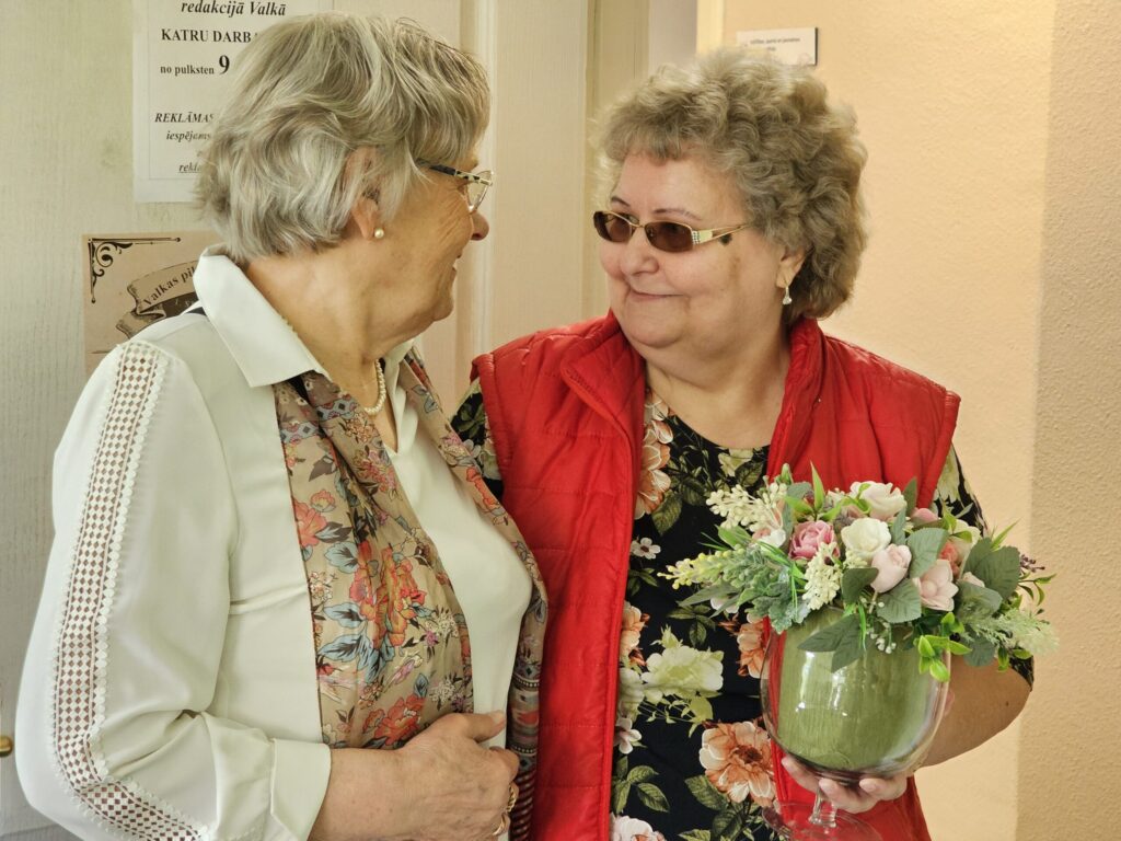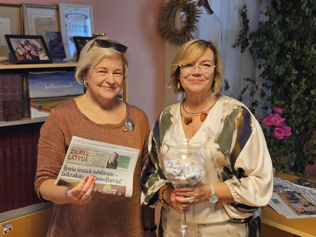 Apsveikumi svētkos birst kā no pārpilnības raga. Katram, arī kolēģiem no citiem laikrakstiem, ir vēlējums gaviļniekam. Sveicienu ar īpaši “Ziemeļlatvijai” sadzejotām vārsmām velta Anita Rozenberga, “Bauskas Dzīves” galvenā redaktore (no labās).