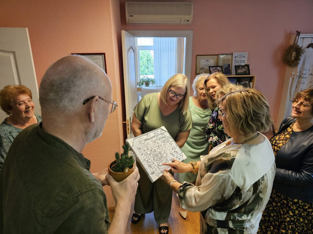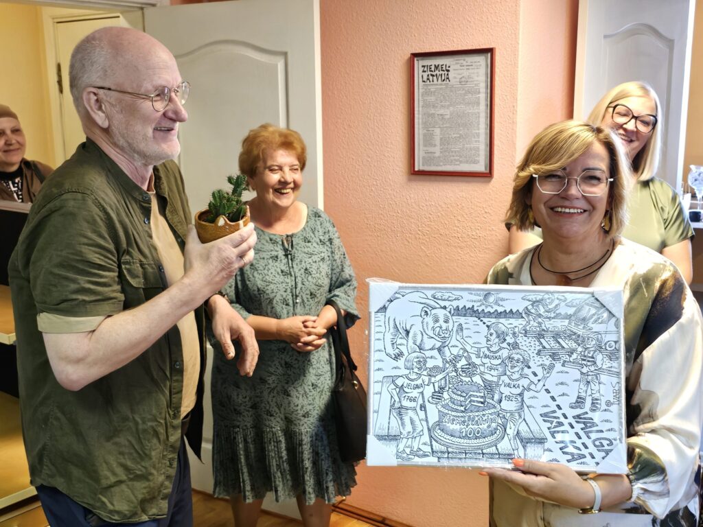 Kolēģis no “Zemgales Ziņām” Gaitis Grūtups dāvina simtgadei darināto karikatūru, kurā trāpīgi attēlots viss, ar ko jelgavniekiem asociējas Valka.