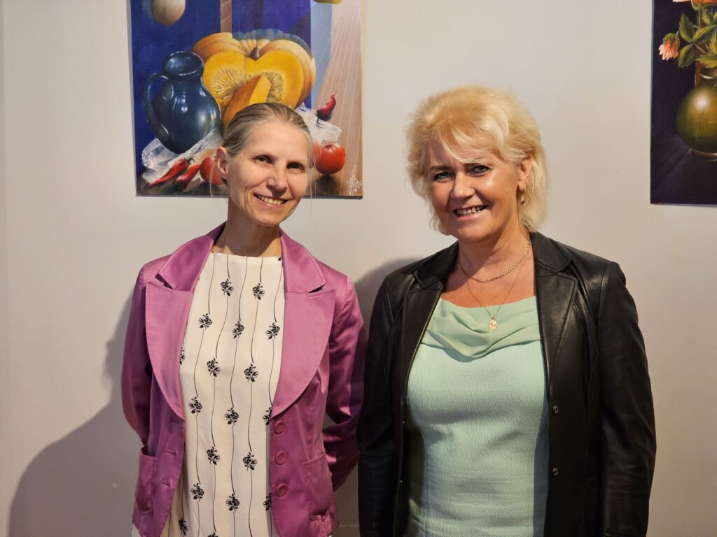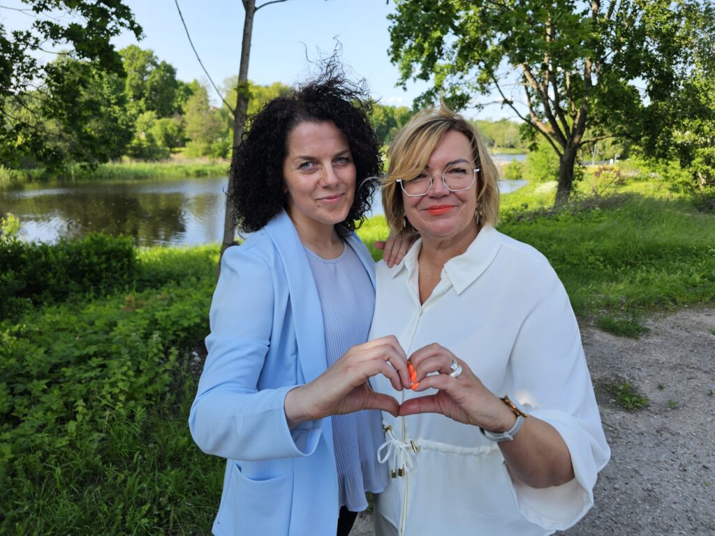 “Ziemeļlatvijas” galvenā redaktore Ingūna Johansone (no labās) ar lepnumu kolēģei Sandrai Apinei no “Alūksnes un Malienas Ziņām” rāda laikraksta 1. numura kopiju, kas novietots redakcijā pie sienas.
